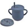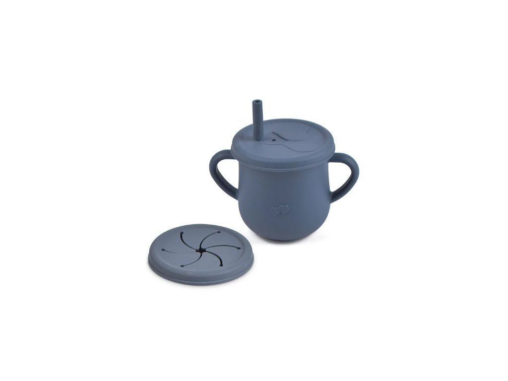 Silikonový hrnek 2v1 má 2 druhy víček, jeden s brčkem na pití a druhý s otvory na dobroty, které jen tak nevypadnou.